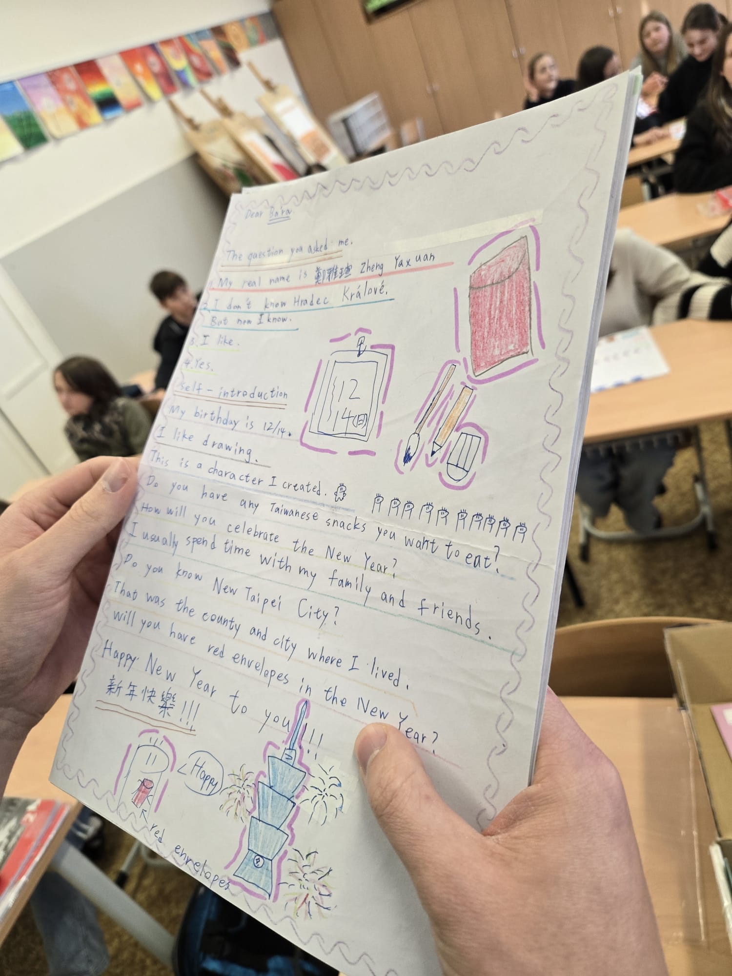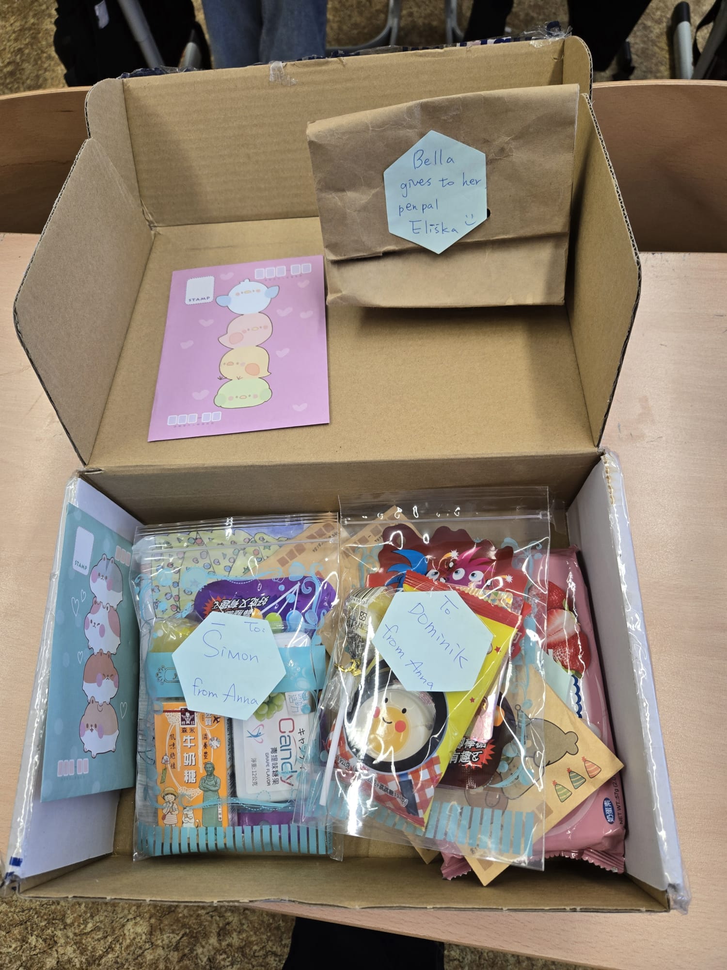 Naše zahraniční spolupráce se rozvíjela i během vánočních svátků a po nich. Partneři z Taiwanu byli nadšeni z perníčků, které děti samy upekly. Ve svých dopisech hojně děkovaly za nové chuťové zážitky. Na oplátku jsme i my obdrželi balíček plný cizokrajných svačinek. Náš novoroční balíček bude obsahovat vlastnoručně vyrobené dárky, a to nejen ke Dni svatého Valentýna.