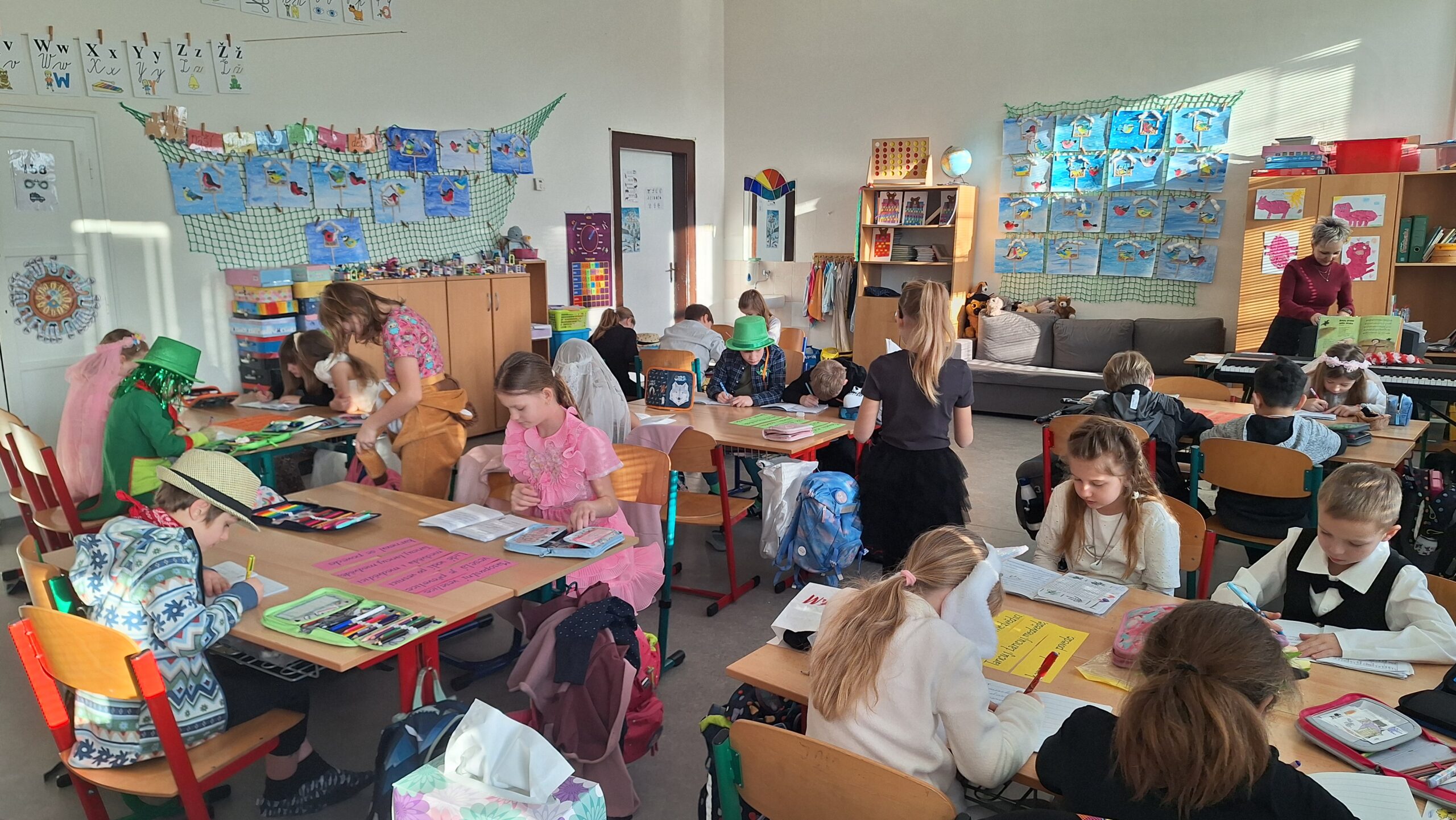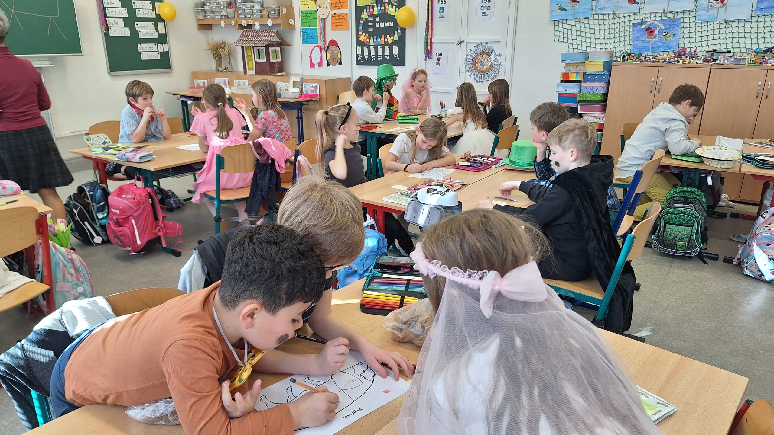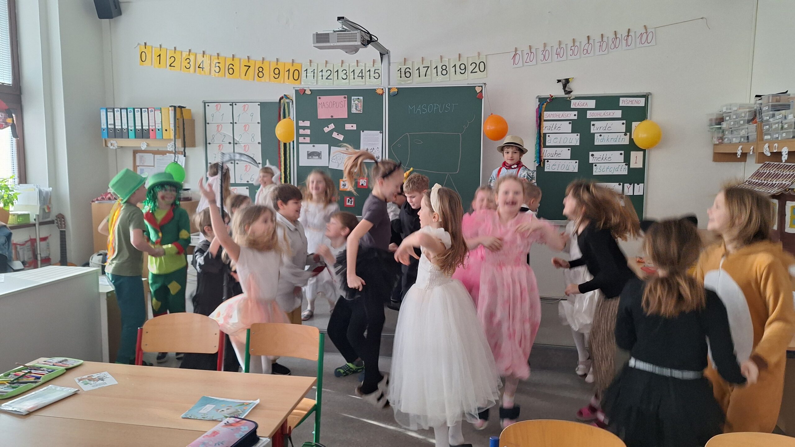 Učení tentokrát probíhalo zábavně – ve skupinkách jsme skládali básničku, řešili úlohy, rýsovali i počítali při tanci. Nechyběl masopustní soud se „stárky“, kteří vynášeli veselé rozsudky.