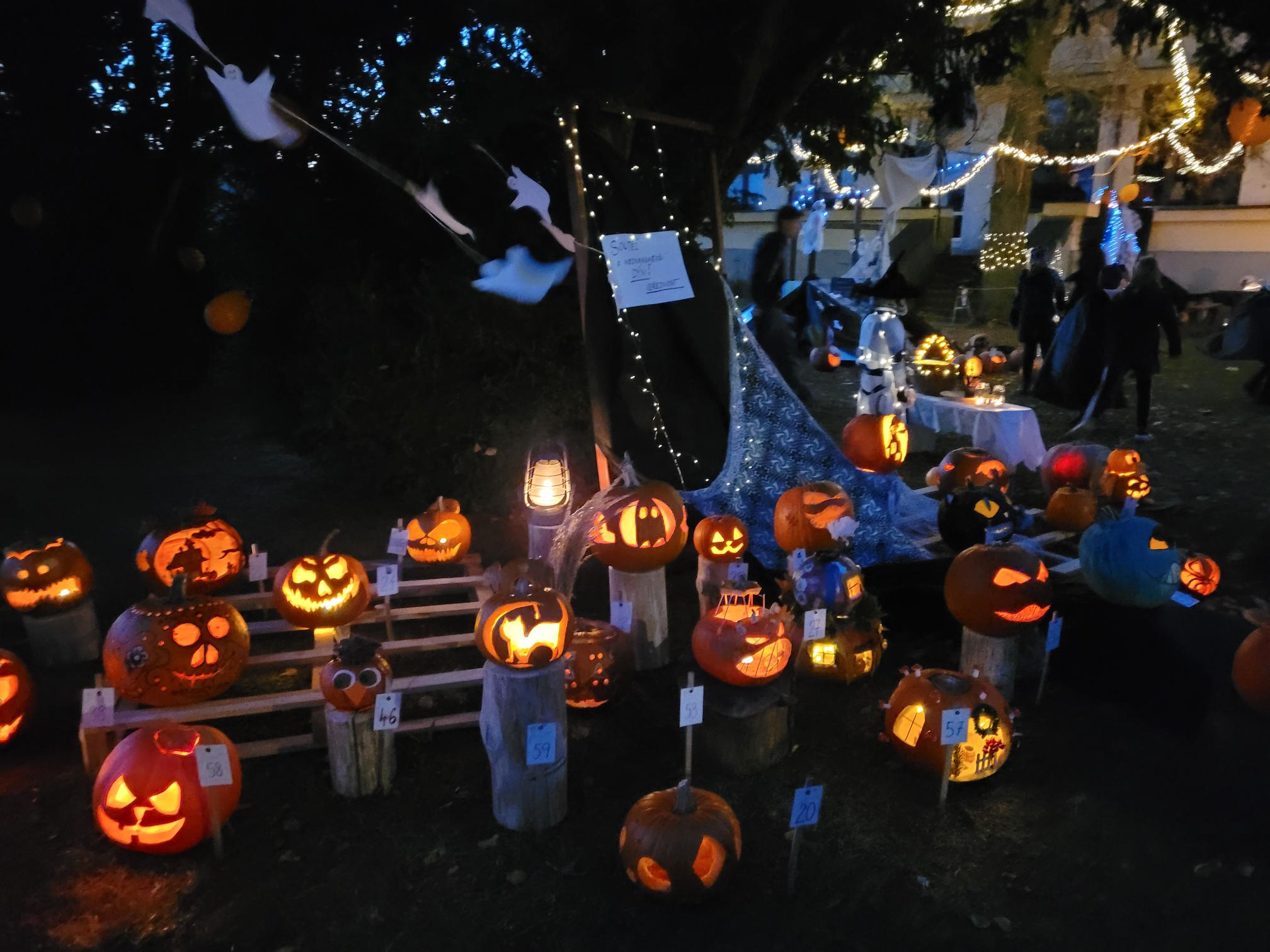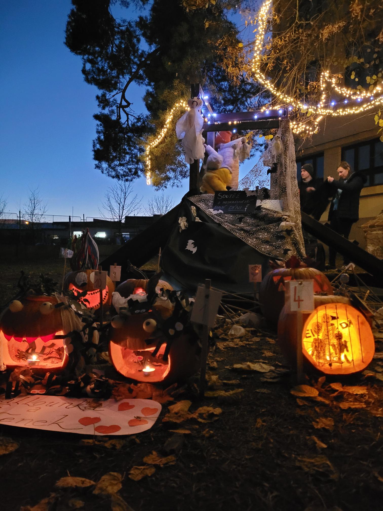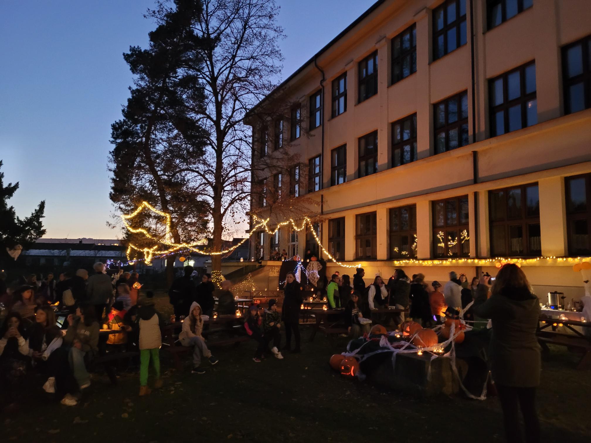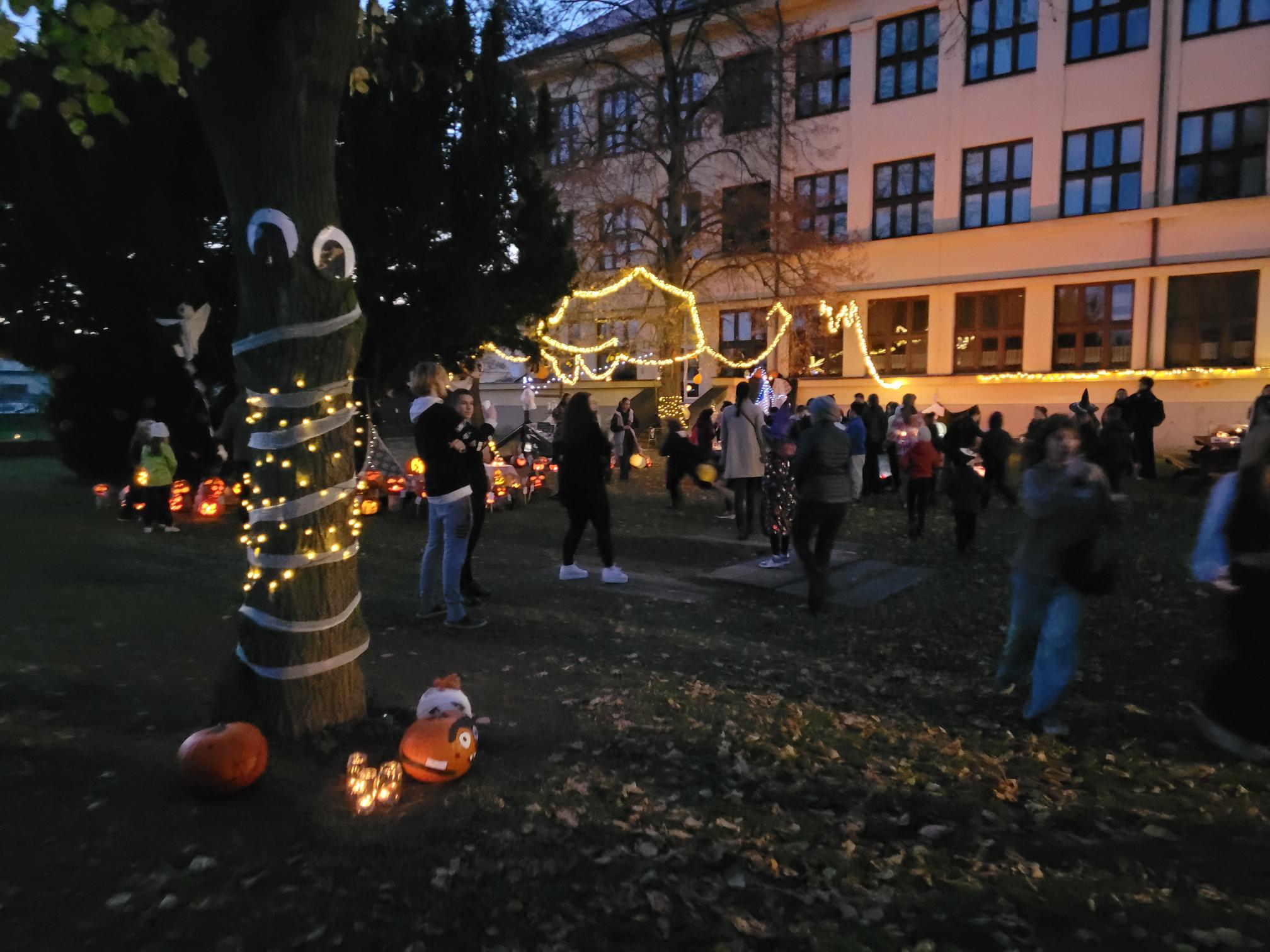 V pátek 7. listopadu se na naší škole uskutečnily dýňové slavnosti. O půl páté vykročil od hlavního vchodu lampionový průvod dlouhý tak, že ho nebylo ani možné zachytit vcelku na jednu fotografii. Účastníky byly nejen děti z naší školy, ale také široká veřejnost. Lampionový průvod prošel přes Plotiště a svou cestu zakončil na školní zahradě, kde se všichni přítomní stali součástí magického večerního reje. Celá zahrada ponořená do tmy byla osvětlená stovkami světýlek a svíček. Vystaveno bylo 60 nádherných svítících soutěžních dýní a byli vyhlášeni výherci z řad žáků i rodičů. Proběhla stezka odvahy, zajištěn byl vynikající strašidelný raut a nechyběl ani tanec v maskách. Byl to kouzelný večer!
