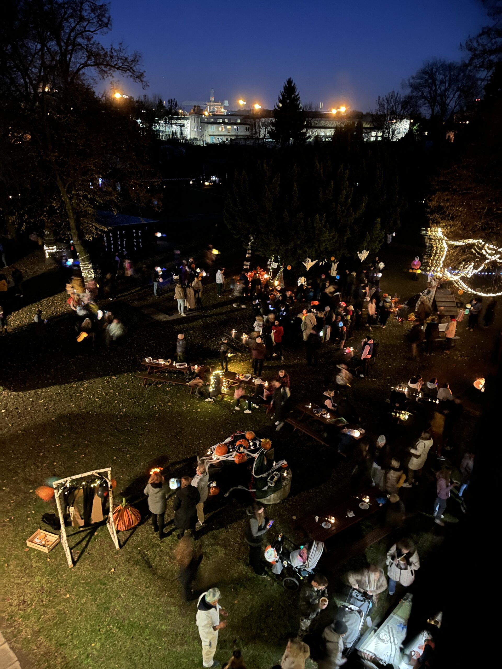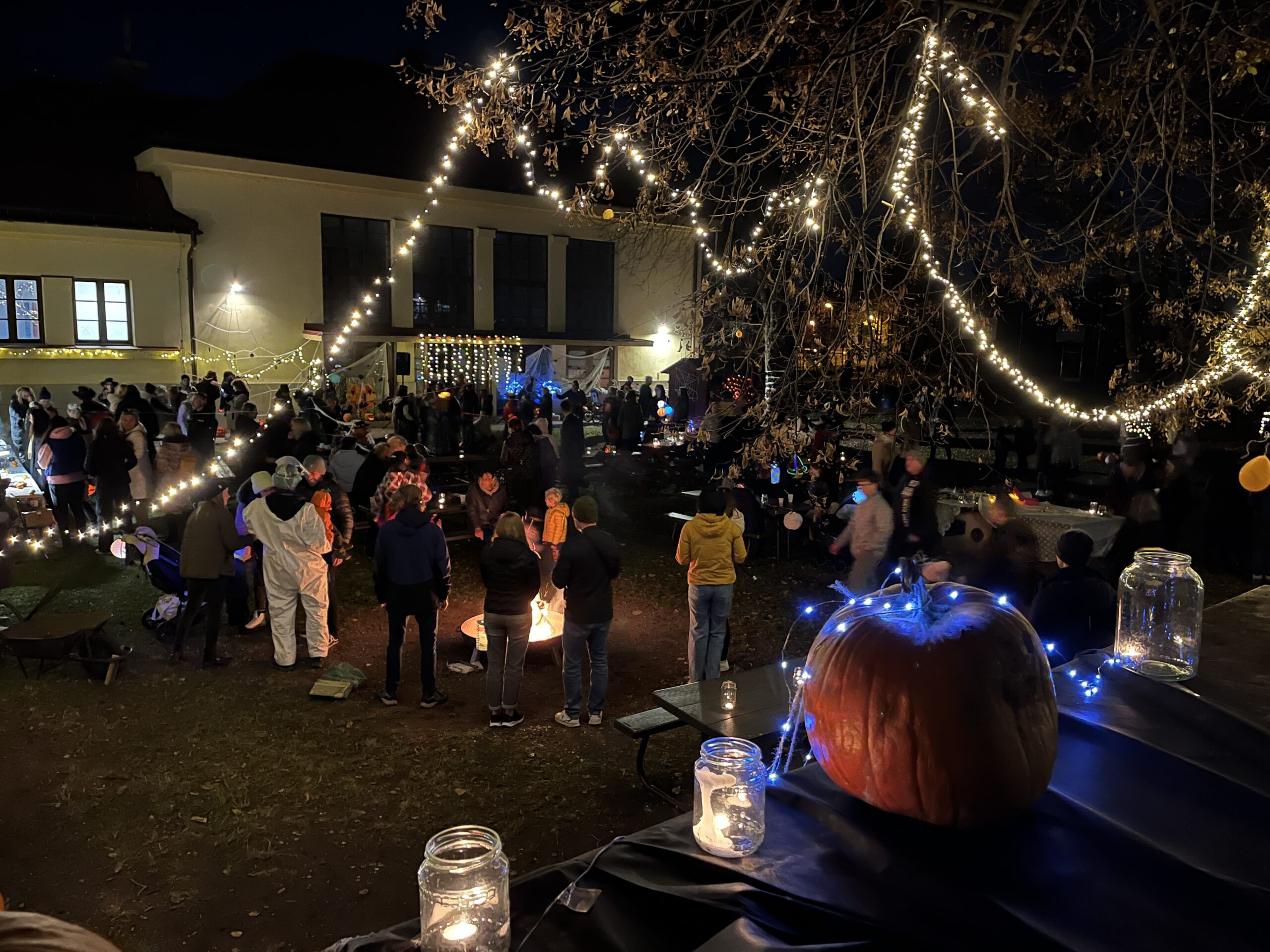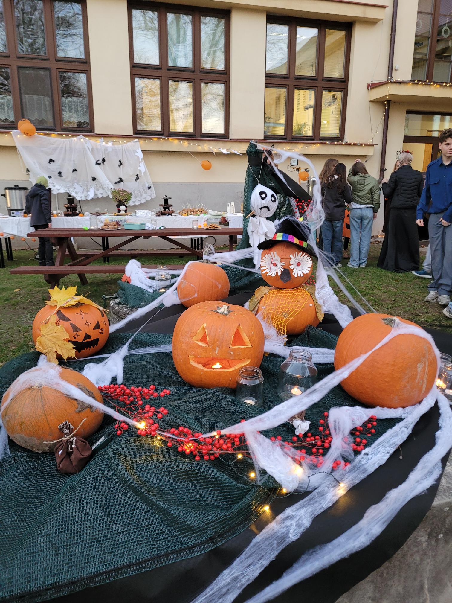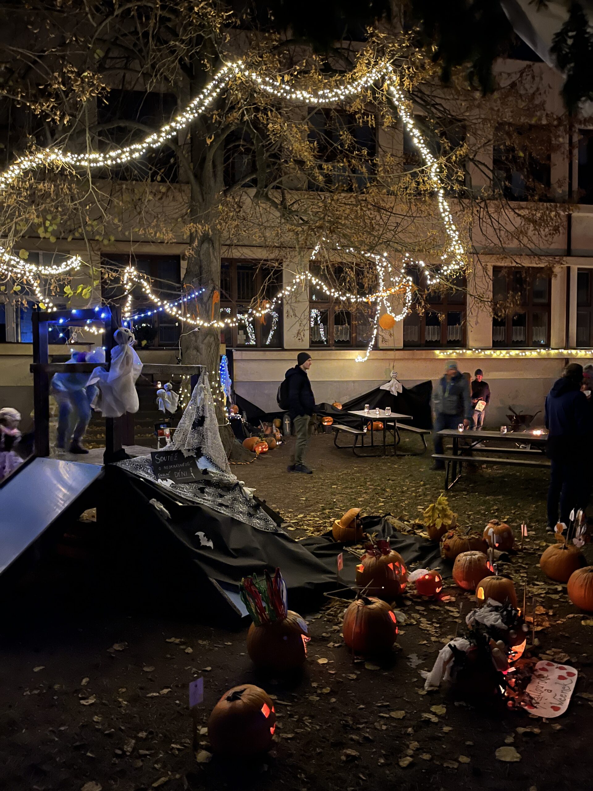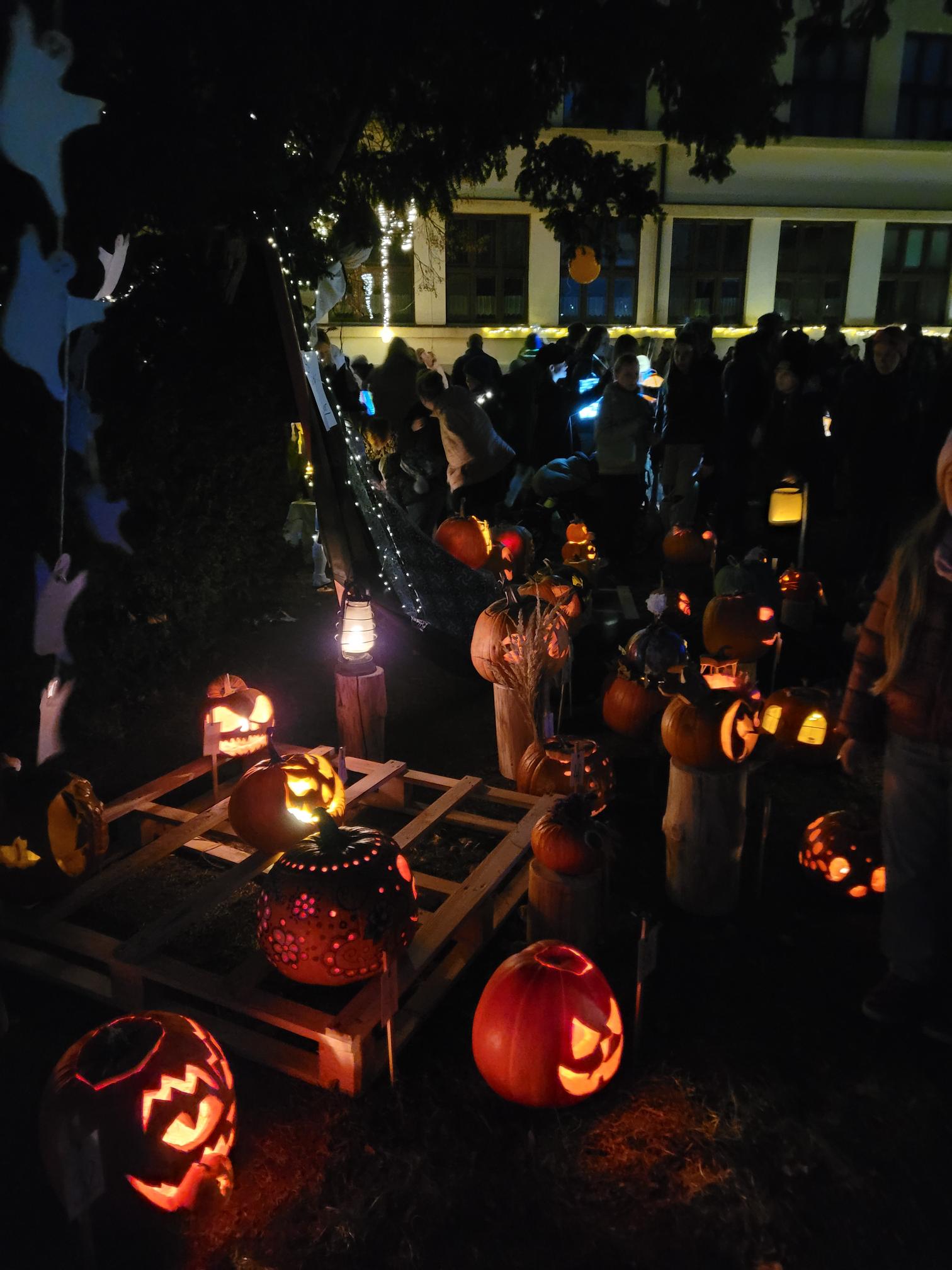 V pátek 7. listopadu se na naší škole uskutečnily dýňové slavnosti. O půl páté vykročil od hlavního vchodu lampionový průvod dlouhý tak, že ho nebylo ani možné zachytit vcelku na jednu fotografii. Účastníky byly nejen děti z naší školy, ale také široká veřejnost. Lampionový průvod prošel přes Plotiště a svou cestu zakončil na školní zahradě, kde se všichni přítomní stali součástí magického večerního reje. Celá zahrada ponořená do tmy byla osvětlená stovkami světýlek a svíček. Vystaveno bylo 60 nádherných svítících soutěžních dýní a byli vyhlášeni výherci z řad žáků i rodičů. Proběhla stezka odvahy, zajištěn byl vynikající strašidelný raut a nechyběl ani tanec v maskách. Byl to kouzelný večer!